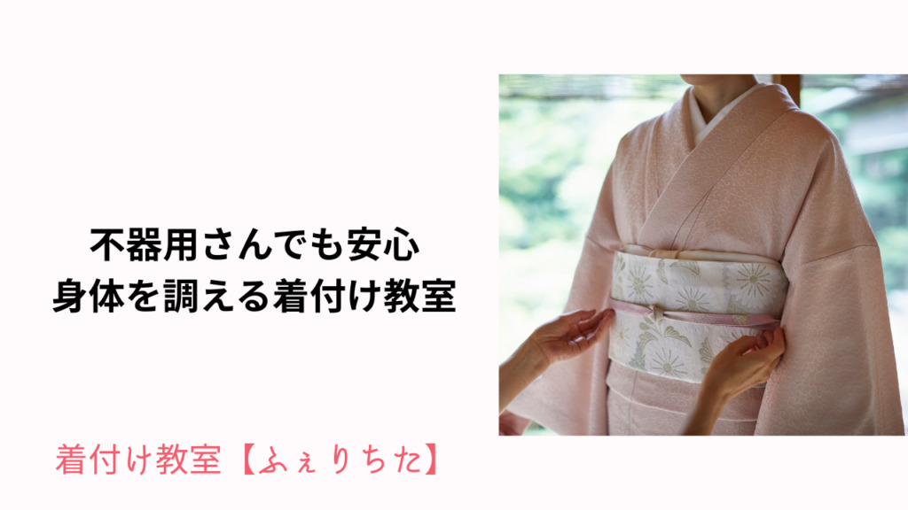 ふぇりちたは、“身体を整える着付け”を教われる教室です。「着物は苦しい」「着付けは大変」と思っている方でも、心地よく着物を着るコツが学べます。